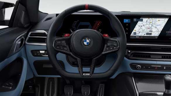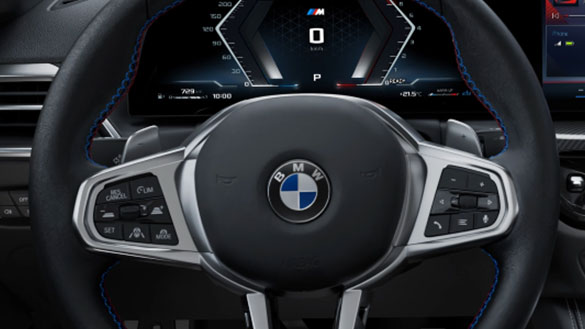 Skórzana kierownica BMW M , z wyprofilowanymi miejscami na palce i spłaszczonym designem, zapewnia doskonałą kontrolę i komfort. Oznaczenie na godzinę 12 ułatwia orientację w ustawieniu kierownicy, a logo M akcentuje sportowy charakter.