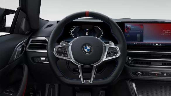 Kierownica M obszyta alcantarą zapewnia pewny i komfortowy chwyt, a czerwone oznaczenie na godzinie 12:00, emblemat M oraz kontrastowe szwy w kolorach M podkreślają wyścigowy charakter wnętrza, przynosząc uczucie bycia blisko toru nawet podczas codziennej jazdy.